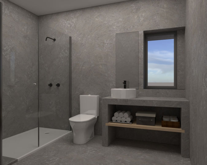 As paredes serão pintadas de cor branca e os caixilhos serão cinzentos indo de encontro ao elemento de betão criando para enquadrar a janela da sala mais generosa que é agora aberta, criando ao mesmo tempo um elemento que faz lembrar os antigos “poiais” existentes junto às portas de entrada das casas alentejanas e que serviam como banco.